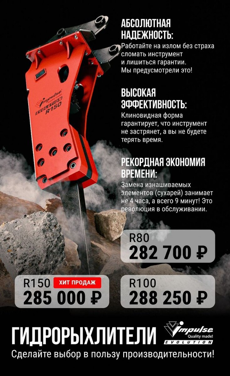 Гидрорыхлитель Impulse R150 Evolution: подробный обзор, преимущества и сферы применения Российский рынок гидравлического оборудования активно меняется: появляются новые решения, которые увеличивают производительность и расширяют возможности операторов спецтехники. Одним из таких решений стал гидрорыхлитель Impulse R150 Evolution — инновационная разработка завода «Технопарк Импульс». Модель была представлена в 2022 году и сразу получила статус уникального оборудования, не имеющего аналогов в мире. Что такое гидрорыхлитель и почему Impulse Evolution — это новый уровень Обычный гидромолот работает по ударному принципу и не предназначен для работы на излом: любая боковая нагрузка приводит к ускоренному износу пики или её разрушению. В городском демонтаже и при добыче породы такие нагрузки неизбежны. Гидрорыхлитель Impulse R150 Evolution объединяет: