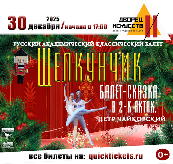 30 декабря в 17:00 на Большой сцене Дворца искусств Ленинградской области состоится спектакль «Щелкунчик» в исполнении Русского академического классического балета. Цена? От 2500 ₽.