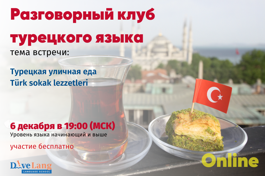 Тема встречи: Турецкая уличная еда Türk sokak lezzetleri Жизнь на улицах в Турции кипит. Что купить для того, чтобы насладиться вкусами уличной турецкой кухни? ➡️Что такое мороженое Maraş dondurması и чем оно отличается от других видов данного лакомства. Чем примечательны продавцы мороженого? Узнаем на нашем разговорном клубе. 🥐На улице в Турции можно купить турецкую выпечку. Узнаем, какие виды турецкой выпечки можно купить в киосках и прилавках. 🌯 Мясо и рыба—важная часть турецкой кухни, в том числе уличной. Многим известен döner. Изучим названия и других мясных и рыбных уличных блюд. 🌰 Какая же турецкая уличная кухня без кумпира и жареных каштанов? Посмотрим видеорецепты этих блюд, изучим слова, связанные с приготовлением пищи и названия ингредиентов данных блюд. ➡️Изучим фразы, с помощью которых научимся заказывать еду, а также благодарить за вкусную еду и желать продавцу хорошей и плодотворной работы. Konuşma kulübünde görüşürüz! _____________________ Встречаемся 6 декабря в