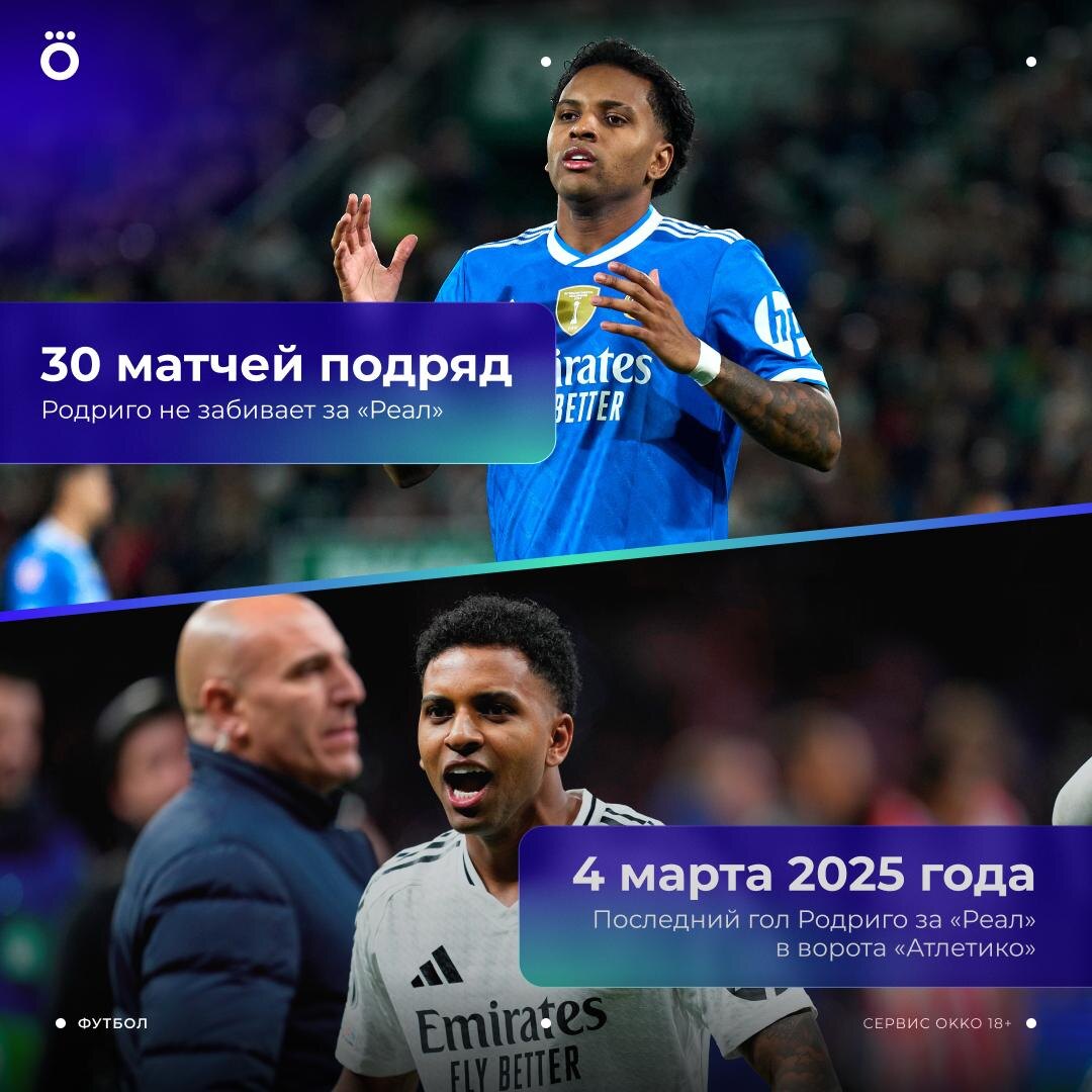 Родриго страдает. У бразильца худшая безголевая серия среди всех нападающих в истории «Реала» 🤯 Такой же результат был у Диаса Мариано за мадридцев. Тяжело.. Сможет ли Родриго забить «Атлетику» сегодня? 👍 / 👎