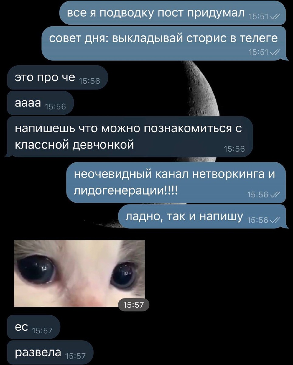 📸 Совет дня: выкладывай сторис в телегу Неочевидный канал лидогенерации. Ты увидишь просмотры от людей, которых нет в записной книжке. А ты у них по какой-то причине есть. Дальше дело остается за малым: 1. Изучи профиль и био 2. Напиши, познакомься 3. Предложи ценность, либо че-то ещё Я сам так регулярно делаю. Только настрой конфидециальность заранее, и в путь. Попробуй прямо сейчас. Просто опубликуй этот пост в сторис у себя. @izib2b