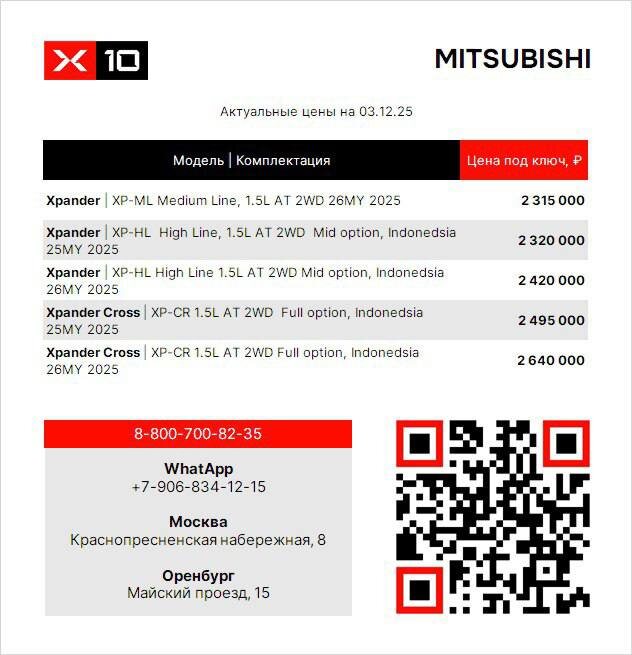 💸Актуальные цены на Mitsubishi Xpander (2025). На видео — XP CR Full option 2026 модельного года. Подробнее о ней смотрите в обзоре👆 🤑 Цены указаны с учётом растаможки и доставки в Москву Оцените отзывы наших клиентов и сделайте правильный выбор вместе с нами! 📞 8 800 700-82-35 🚘.market 📞 8 919 868-97-47 Иван 📞 8 922 856-66-66 Сергей (авто из Кыргызстана) 💬 WhatsApp 💙 Сообщество в VK 📍Оренбург, проезд Майский, 15 📍Москва, Краснопресненская набережная, 8 #автоподзаказ #mitsubishixpander #x10прайс #х10ОАЭ