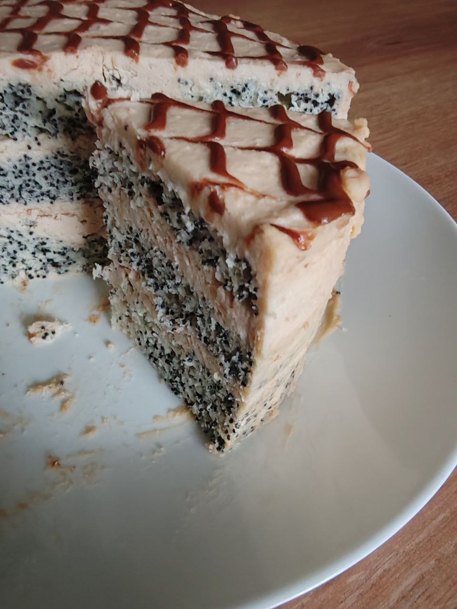 🍰 Маковый кето-торт с маскарпоне *Нежный, ароматный и по-настоящему кето-дружелюбный десерт!* --- ИНГРЕДИЕНТЫ 🥚 Для бисквита - Маскарпоне — 50 г - Сливочное масло — 20 г - Миндальная мука — 30 г - Мак — 30 г - Яйца — 2 шт. (~100 г без скорлупы) - Разрыхлитель — 1 ч.л. (~4 г) - Смесь сукралозы и эритрита — 1 г - Соль — щепотка (~0.5 г) 🥥 Для кето-щербета (готовится отдельно, в торт идёт только 120 г) - Кокосовое молоко — 500 мл - Эритрит — 90 г → *Готовится 30 мин на среднем огне до загустения. В торт добавляется только 120 г готового щербета.* 🧀 Для крема - Маскарпоне — 150 г - Кето-щербет (готовый) — 120 г - Лимонный сок — 1 ст.л. (~15 г) --- ПРИГОТОВЛЕНИЕ 1. Приготовьте кето-щербет: Смешайте кокосовое молоко и эритрит в кастрюле. Варите 30 минут на среднем огне, постоянно помешивая, до загустения и светло-кремового/коричневатого цвета. Остудите. Отмерьте 120 г — это и будет частью торта. Остальное отложите или используйте отдельно. 2. Приготовьте бисквит: Растопите сливо