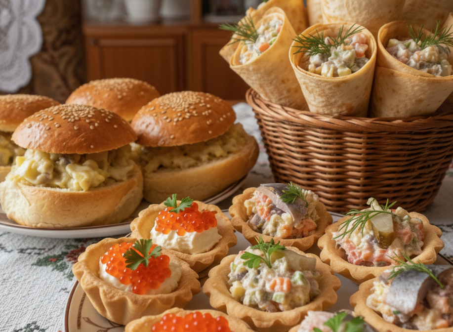 И ещё: всё это можно заранее заготовить. Булочки – за день испечь, тарталетки – за два дня, они спокойно хранятся. Лаваш вообще можно морозить. То есть к празднику подходите уже с готовыми основами, только начинки сделать останется. Никакой беготни, никакой паники!
