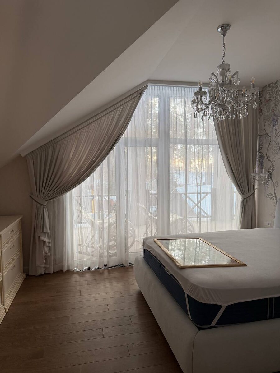 В эфире — реализация дизайнера Симагиной Натальи, которая заслуживает отдельного внимания. Весь характер этого необычного пространства мы создали с помощью текстиля, тщательно оформив каждую комнату: 🛏️ Две спальни с косыми окнами. Одна — в светлой, воздушной гамме с акцентом из ленты репс. Вторая — в глубоких, уютных тонах. В обеих мы лишь подчеркнули натуральность материалов и живописные виды из окон. 🛋️ Гостиная с разными окнами. На пятиметровую конструкцию установили лифт-систему с тканым коробом. Меньшее окно украсили изящной шторой со складкой «гусиная лапка» и портьерами из цветочного жаккарда. 🍽️ Кухня и выход на террасу. В зоне готовки — практичная римская штора с полупрозрачным полотном. А переход оформили портьерами в мягких оттенках синего, завершив образ стильными подхватами в тон. 🌿 Тёплая терраса. Окна по периметру мы закрыли текстилем, оставив верх открытым для света. Это решение наполнило пространство воздухом, а светлые портьеры с цветочным принтом добавили лёгк