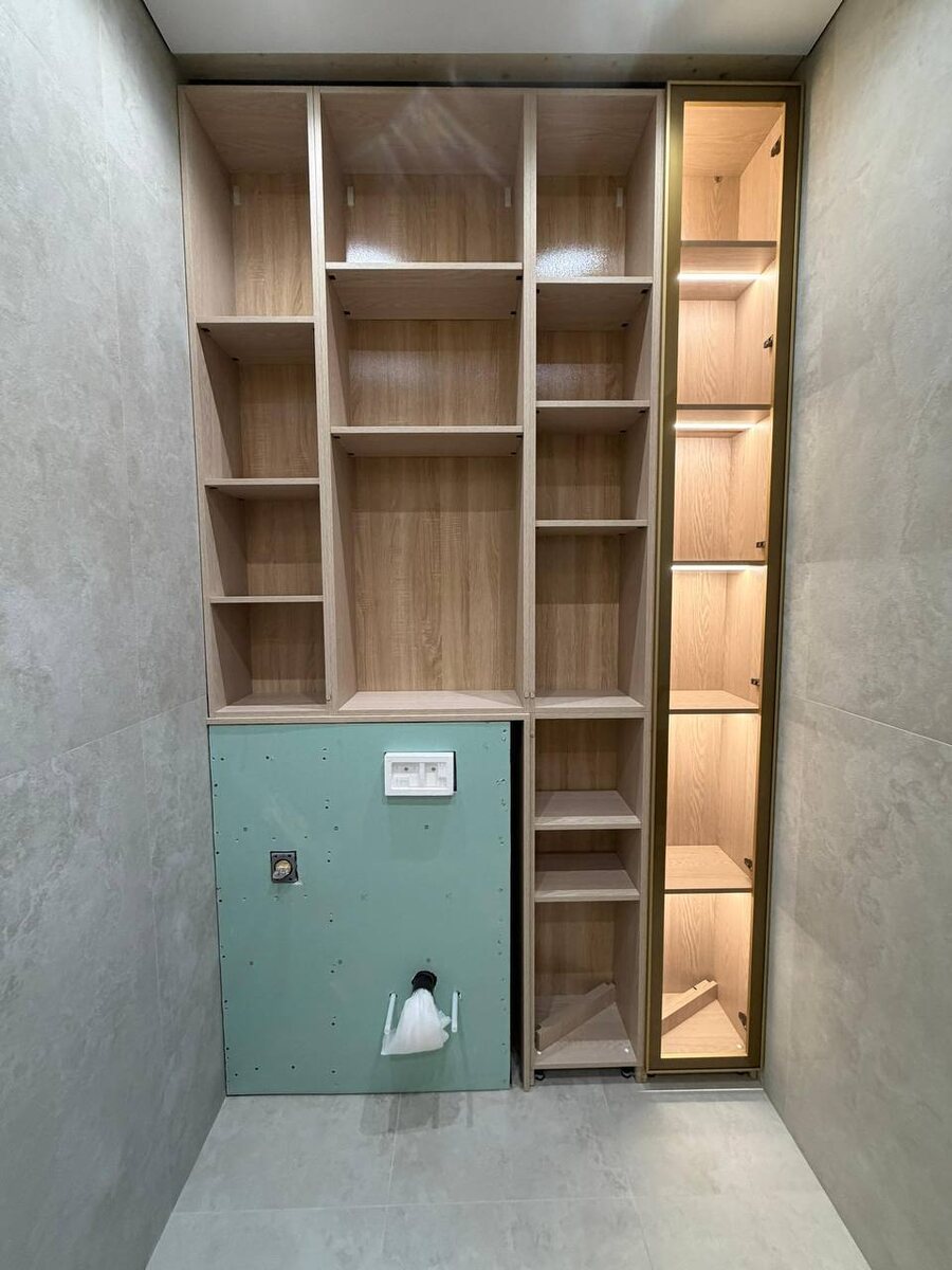 История этого проекта заключается в том, что к нам обратилась постоянная клиентка за мебелью в ванной из шпона. Чтобы сэкономить, она попросила нас изготовить корпус и дать размеры компании, у которой заказали непосредственно шпон. Что нами было сделано : ✅Построили проект и согласовали его с заказчиком ✅ Предоставили корпус ✅ Повесили фасады, так как компания по производству шпона не делает присадки под петли Мы гордимся тем, насколько мы круто собираем инсталляции и санузлы, потому что это очень сложная, большая работа. Как бы Вы оценили результат изделия, выполненного таким способом? Почему у нас шпон дороже? ❤️🔥Шпон мы клеим сами вручную, и не используем готовые панели, мы все готовим с нуля. Шпон мы выкупаем сразу на весь объект, чтобы получить один и тот же цвет. И понимаем, как будет вести себя дерево при различных сценариях. Это отличный для нас опыт, так как это редкая возможность увидеть работу других мебельщиков на наших проектах.