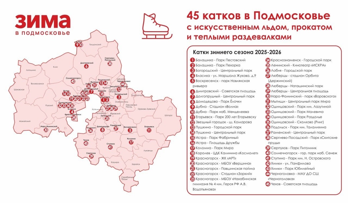 ✨ ❄️ Сегодня мы открываем зимний сезон. В Подмосковье будут работать 45 сезонных катков с искусственным льдом, включая пять новых: в Дмитрове, Воскресенске, Звездном городке, Власихе и Краснознаменске. Там, где лед будет натуральный, откроем позже, когда установится минусовая погода. Все места для катания традиционно будут комфортными и безопасными: с прокатом инвентаря, теплыми раздевалками и шкафчиками для хранения вещей, воздушными сушками для ботинок и музыкой для отличного настроения. Забронировать сеанс можно на нашем портале «Спорт Подмосковья» (sport.mosreg.ru/) или через приложение Добродел (uslugi.mosreg.ru/app). ⭐Разместить публикацию ⭐Поддержать голосом ✅ Спортивный Чехов https://dzen.ru/id/66f02564335c7475d84fbf87 http://vk.com/chehov_sport http://dzen.ru/chehov_sport
