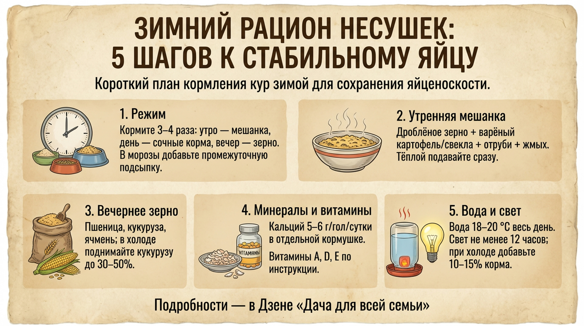 В 7:30 — тёплая мешанка: дроблёная пшеница и кукуруза, отварной картофель, отруби, ложка жмыха, щепоть соли, витаминки по инструкции. В 12:30 — тёртая морковь или свекла, немного травяной муки или сушёной крапивы, подсыпка ракушки в отдельную кормушку. В 15:30 — если холодно, жменька зерна на подогрев. В 17:30 — основная сухая смесь: пшеница, кукуруза, ячмень. Вода в поилках тёплая весь день, свет до 18:30. Чистка кормушек — каждый вечер, чтобы утром всё было сухо и без кислого запаха.