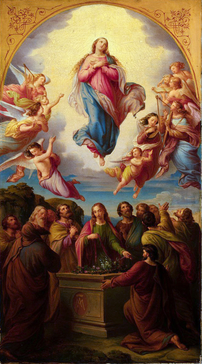 Талант Леопольда Купельвизера (1796-1862) был рано замечен: уже в двенадцать лет он поступил в Венскую академию изящных искусств. С 1823 по 1825 год он жил в Риме, где попал под влияние движения назарейцев. Обосновавшись в Вене, он прославился как иллюстратор, художник, расписывающий витрины, и портретист. Позже Купельвизер обратился к религиозным фрескам и алтарным образам, заслужив репутацию церковного художника. Он расписал множество венских церквей, написал несколько картин для Печского собора и расписал главные алтарные образы в соборе Калоча и приходской церкви Йожефвароша в Будапеште. В 1837 году художник стал профессором Академии, а в 1850 году был награждён Рыцарским крестом ордена Франца Иосифа. Эта относительно небольшая (53.5 x 30 см) картина «Вознесение Девы Марии», возможно, была написана как дополнение к заказу; в конечном итоге она была написана в полный размер и стала главным алтарём монастырской церкви Богоматери в Пече. В композиции заметно влияние ренессансной