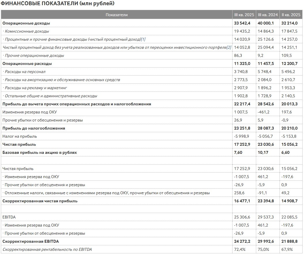 Московская биржа, отчет МСФО за 3 кв. 2025 г. 📈 Комиссионные доходы — ₽19,4 млрд (+30,75% г/г) 📉 Чистый процентный доход — ₽14 млрд (-44,3% г/г) 📉 Операционные расходы — ₽11,3 млрд (-1,2% г/г) 📉 EBITDA — ₽25,3 млрд (-14,35% г/г) 📉 Чистая прибыль — ₽17,3 млрд (-25% г/г) ✔️ Что хорошего в отчете? Биржа демонстрирует хороший комиссионный доход на фоне высокой клиентской активности, а также в связи с запуском новых продуктов и услуг. Комиссионные доходы на рынке облигаций выросли на 90,2%. Комиссионные доходы денежного рынка выросли на 28,2%. Комиссионные доходы срочного рынка выросли на 41,5%. А вот комиссионные доходы на рынке акций выросли всего на 0,5% на фоне увеличения объемов биржевых торгов на 0,9%. Расходы на персонал снизились на 20,6% в связи с уменьшением резервов на выплату премий после снижения прибыли в годовом исчислении. ❌ Риск процентного дохода Основной финансовый риск — это дальнейшее снижение ключевой ставки может продолжить оказывать давление на процентные доходы