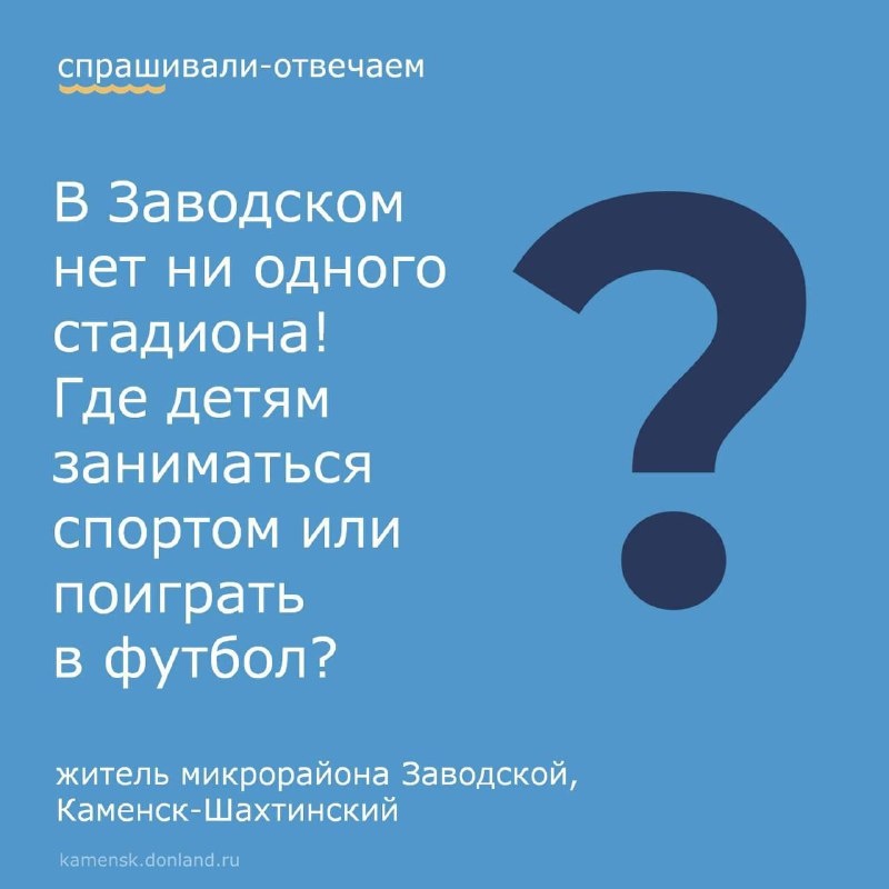 На одном из областных Интернет-ресурсов опубликовано обращение жителей микрорайона Заводского, которых беспокоит состояние стадиона. Стадион в Заводском уже много лет не функционирует и даже, по некоторым данным, не зарегистрирован как спортивный объект и не находится на балансе администрации города. «Где же детям заниматься спортом?» — переживают люди. Однако возможности для занятий детей спортом есть и активно используются на базе других объектов. Так, в микрорайоне Заводском для молодежи функционируют отделения футбола и легкой атлетики спортивной школы №2. Занятия проводятся в спортивном зале Каменского техникума строительства и автосервиса и в школе №8. Условия проведения тренировок и соревнований соответствуют всем требованиям. В перспективе спортивной школой №1 планируется открытие отделения спортивной гимнастики. Кроме того, свои филиалы в Заводском планируют открыть детский футбольный клуб имени Данцева и ФК «Каменск Юниор». Соб. инф.