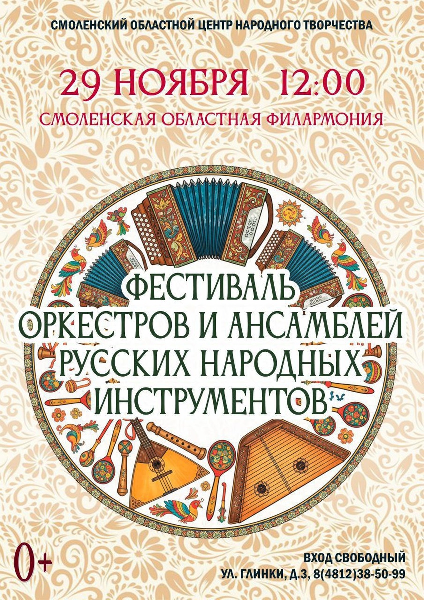 Незабываемое музыкальное событие! 📯29 ноября в 12:00 приглашаем на фестиваль оркестров и ансамблей русских народных инструментов. На сцене Смоленской областной филармонии выступят лучшие коллективы региона, которые представят: 🔸️ традиционные русские народные песни в обработке; 🔸️ произведения современных композиторов; 🔸️ известные композиции военных лет. Приходите познакомиться с многообразием звучания русских народных инструментов и открыть для себя авторские обработки музыкальных произведений — неотъемлемой части нашего культурного наследия. Вход свободный 📍Адрес: ул. Глинки, 3 ☎️Справки по телефону: 8 (4812) 38-50-99 #СмоленскийЦентрНародногоТворчества