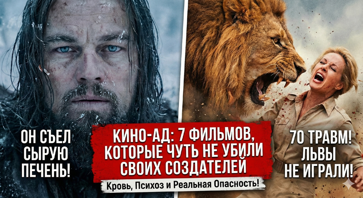 Мы привыкли видеть магию кино на экране, не задумываясь о цене, которую заплатили создатели. Иногда фраза «Камера, мотор!» звучит как приговор. История Голливуда знает проекты, где съемочная площадка напоминала зону боевых действий, а актеры молились о завершении контракта. От атак настоящих львов до супа с наркотиками — мы собрали 7 шедевров, которые чудом добрались до проката, едва не убив своих создателей. Когда режиссер требует «реализма», актерам приходится забыть о комфорте трейлеров. 1. «Выживший» (The Revenant, 2015) Алехандро Иньярриту отказался от зеленых экранов. Он потащил группу в канадскую глушь при минус 30°C. 2. «Фицкарральдо» (Fitzcarraldo, 1982) Вернер Херцог решил перетащить настоящий 320-тонный пароход через гору в джунглях Амазонки. Без спецэффектов. Кэмерон — гений, но работать с ним — испытание для психики. 3. «Бездна» (The Abyss, 1989) Съемки проходили в недостроенной атомной электростанции, заполненной миллионами литров воды. 4. «Титаник» (Titanic, 1997) Самая
