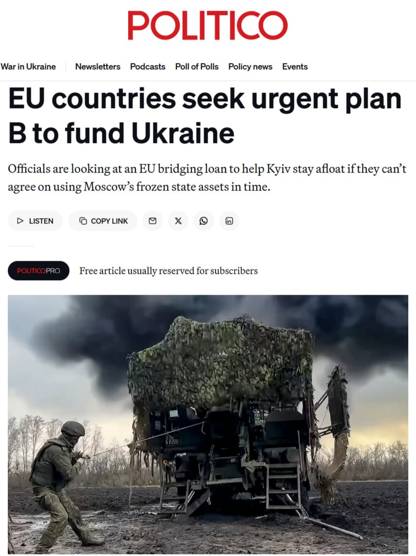 Politico: Европейские страны работают над экстренным планом «Б», который позволит не допустить, чтобы Украина осталась без денег в начале следующего года. Месяц назад на саммите лидеры Евросоюза надеялись договориться о предложении использовать замороженные резервы Москвы для «репарационного кредита» Украине в размере 140 миллиардов евро, однако эта идея столкнулась с ожесточенным сопротивлением со стороны Барта де Вевера, премьер-министра Бельгии, где хранятся эти деньги. Теперь, когда мирные переговоры активизировались, а у Киева не хватает денег, вопрос о том, что делать с российскими активами, приобрел новую актуальность. «Если мы не будем действовать, другие начнут действовать раньше нас», — заявил один чиновник ЕС, которому, как и другим упомянутым здесь лицам, было предоставлено право говорить открыто и анонимно. Однако, несмотря на интенсивные переговоры между Бельгией и Комиссией в последние недели, Де Вевер по-прежнему обеспокоен юридической ответственностью и риском отве