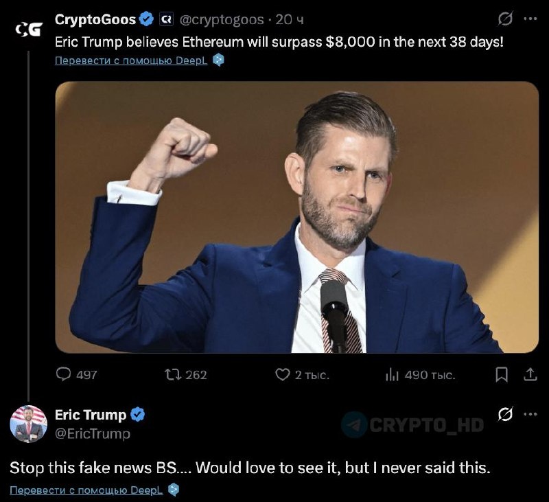 ☹️ В Twitter снова разгоняют фейки – Эрику Трампу приписали прогноз по #ETH за $8000