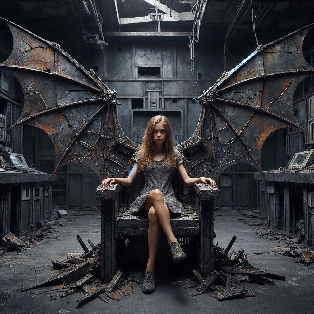 Он нашёл её в тронном зале, который был старой диспетчерской. Она сидела в кресле из спрессованного лома, её стальные крылья, как скелет гигантской летучей мыши, упирались в потолок.