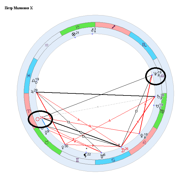 В его изначальной природе конфликт с Богом (поиски его как акт противоборства всему, что существует) прописан в гороскопе Петра Мамонова аспектом Солнце-180-Нептун. В конфликтной природе этого аспекта заложены такие принципы: отрицание добра и Высших Сил через зависимость и погружение в болото алкогольного разврата, желание свои эгоистические вместо доверия в силу провидения и желаний божественных. Вся его жизнь до 45 лет была проявлением эгоистического неверия, отрицания греха и расплаты за это отрицание-депрессии, запои... Усиливает значение веры в жизни этого актера и Северный Узел в знаке Рыб, что говорит о том, что Дух его пришел в это воплоще