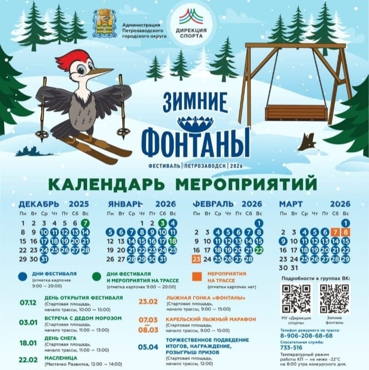 Муниципальное учреждение «Дирекция спорта» Петрозаводска объявило о старте традиционного зимнего фестиваля «Зимние фонтаны». Мероприятие пройдет с 7 декабря по 5 апреля на лыжной трассе «Фонтаны». Организаторы подчеркивают, что фестиваль состоится в любую погоду — при отсутствии снега участники смогут совершать пешие прогулки. В этом сезоне впервые увеличено количество фестивальных дней. Теперь участники смогут отмечаться в своих карточках со среды по воскресенье, то есть пять дней в неделю. Для учета прогулок используется электронная система с чип-картами, которые нужно прикладывать к специальной станции на контрольном пункте в местечке «Развилка». Предварительная регистрация уже началась и продлится до 5 декабря через электронный сервис ОРГЕО. Очная регистрация будет проходить с 1 по 5 декабря в спортивном комплексе «Луми» по адресу Неглинская набережная, 52. В день открытия фестиваля, 7 декабря, зарегистрироваться можно будет непосредственно на стартовой площади трассы «Фонтаны» с 1