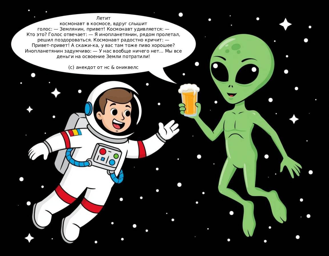 🛰🧑🚀👽🛸 Летит космонавт в космосе, вдруг слышит голос: — Землянин, привет! Космонавт удивляется: — Кто это? Голос отвечает: — Я инопланетянин, рядом пролетал, решил поздороваться. Космонавт радостно кричит: — Привет-привет! А скажи-ка, у вас там тоже пиво хорошее? Инопланетянин задумчиво: — У нас вообще ничего нет... Мы все деньги на освоение Земли потратили! (с) анекдот от нс & ониквелс