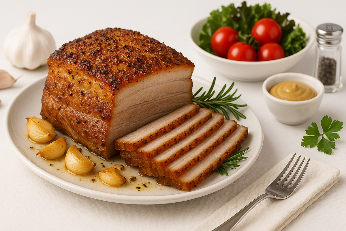 Представьте: вы открываете духовку, а оттуда тянется густой запах чеснока, перца и запеченной грудинки. Корочка румяная и хрустящая, внутри - сочное мясо, которое режется как масло. Такой кусок на столе делает ужин похожим на праздник, даже если сегодня просто вторник. Калорийность на 100 г: 320 ккал Белки 16 г, жиры 28 г, углеводы 0,5 г Грудинка мясная запеченная с чесноком и специями Ингредиенты: Приготовление: Красивая подача: Нарежьте грудинку тонкими ломтиками, выложите веером на деревянную доску, сбоку добавьте маринованный огурец, горчицу и свежие травы. Получится почти ресторанная закуска к домашнему ужину. Лайфхаки и советы: Если рецепт откликнулся - сохраните пост, попробуйте в выходные и напишите, как грудинка зашла вашим домашним.