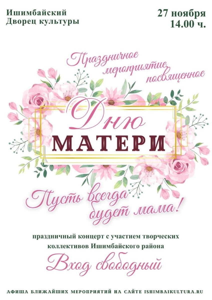 Один из самых добрых и трогательных праздников будут отмечать в Ишимбае в четверг, 27 ноября. В Городском Дворце культуры состоится концерт в честь Дня матери. Начало – в 14 часов. Администрация муниципального района приглашает жителей увидеть яркие и проникновенные выступления творческих коллективов. Песни, танцы и другие номера будут посвящены самым любимым и дорогим людям – мамам! Вход свободный. 0+