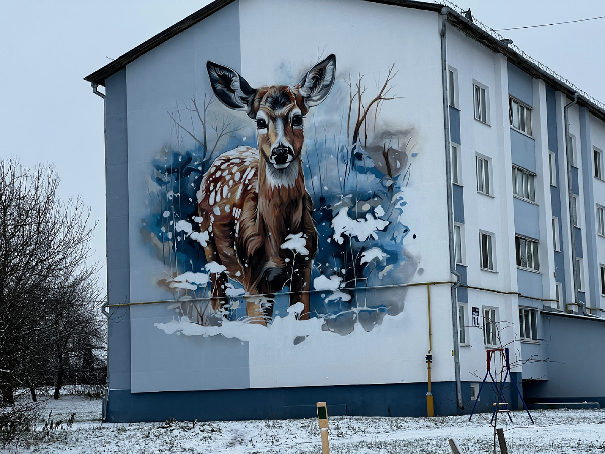 Доброго дня всем! Сегодня заканчивается мой маленький отпуск у родных. Мы поменяли свои планы и назад домой решили добираться не поездом двое суток, а самолетом. Но так как прямых рейсов нет, летим через Москву. Заодно навестим старшую дочь. Минск и Воложин уже два дня заметает снегом. Но я все-таки прогулялась и сфотографировала рисунки на стенах домов. я уже как-то выкладывала фотографии с животными белорусских лесов. Кто хочет, найдет у меня на канале. Появилось еще несколько новых. это лань или олень, даже не знаю. Или вот такой орел. Впечатляет! Но кроме животных в городе много жанровых картин и изображений из истории города. Все они подписаны мелкими буквами под рисунками, но я не снимала. Вот картина рыночной площади. Рисунок на стене овощного магазина. А вот просто какое-то техническое здание. Это одна сторона: Это то же здание, но другая стена: Но если стать так, чтобы были видны обе стены, получится почти обьемная картина: Вот еще картины И еще Это какой-то портрет знаковог