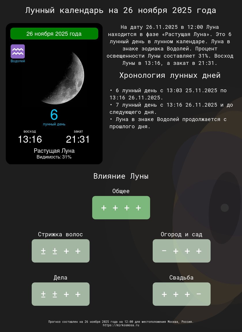 Лунные календари на 26 ноября 2025 года: Подготовьтесь к этому дню с учетом влияния Луны! 🔹🌗 Лунный календарь на 26 ноября 2025 года — Что приготовила Луна? Подробнее 🔹✂️ Лунный календарь стрижек на 26 ноября 2025 года — Подходящий ли день для обновления прически? Подробнее 🔹🌱 Лунный календарь огородника и садовода на 26 ноября 2025 года — Лучшее время для ухода за растениями. Подробнее 🔹📅 Лунный календарь дел на 26 ноября 2025 года — Удачные моменты для важных задач. Подробнее 🔹💍 Лунный календарь свадеб на 26 ноября 2025 года — Подходит ли этот день для вашего торжества? Подробнее
