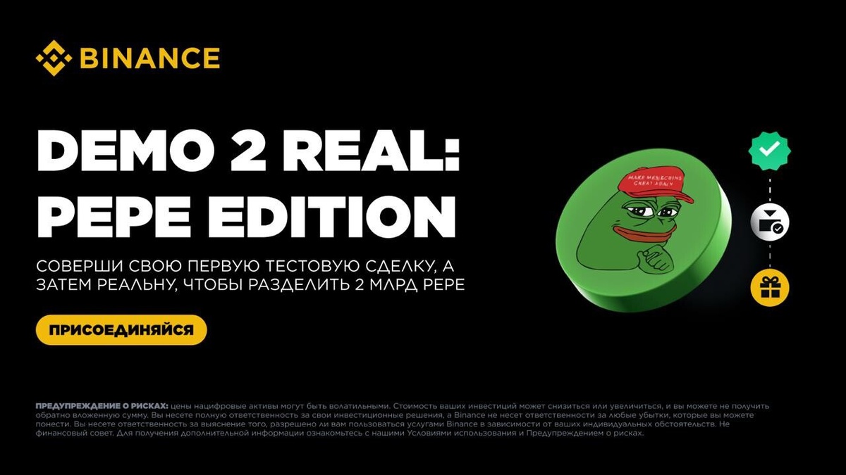 2 миллиарда PEPE за демо торговлю на Binance Самая известная крипто биржа в мире Binance запустила демо торговлю криптовалютами на спотовом и фьючерсном рынках. В честь этого события компания разделит между всеми участниками призовой фонд в размере 2 миллиардов мем монеты PEPE 17 декабря 2025 года. Если у тебя еще нет аккаунта на бирже Binance или твоя первая сделка на бирже бал уже после 16 ноября 2025 года, то выполнив несколько простых условий ты сможешь гарантированно получить вознаграждение. https://cryptoage.com/ru/5271-2-миллиарда-pepe-за-демо-торговлю-на-binance.html