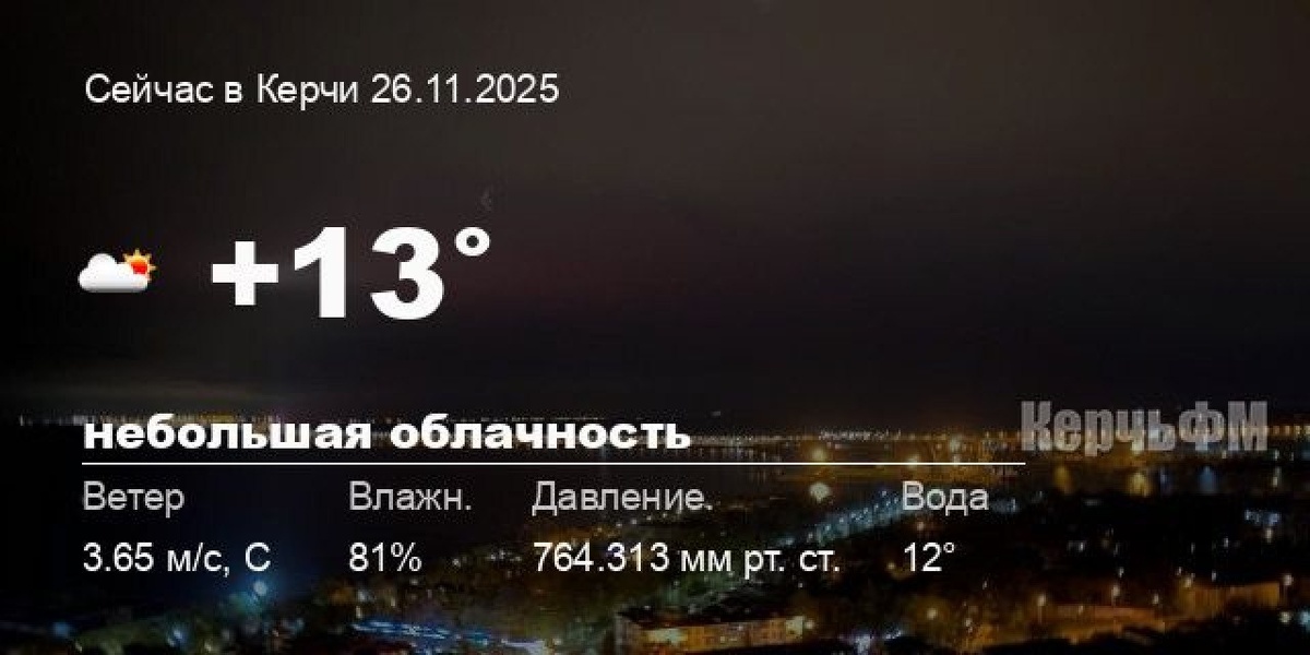 Погода в Керчи 26 ноября Сегодня днем в Керчи, 26 ноября, ожидается переменная облачность, температура воздуха от +11.5° до +14.3°С, ветер северный 3.77 м/с, порывы до 5.45 м/с, давление 764.3 мм рт. ст., влажность 80%. Ближайшей ночью ожидается пасмурная погода, температура +12.8°С. Завтра, 27 ноября, в течение суток ожидается облачная погода; ночью +12.8°С, днем +12.8°С, ветер северный 4.55 м/с. - Феодосия от +11.9° до +14.8°С, ⛅ облачно с прояснениями, море: 14°C - Судак от +9... подробнее Подписывайся на КерчьФМ.РФ @kerchfm