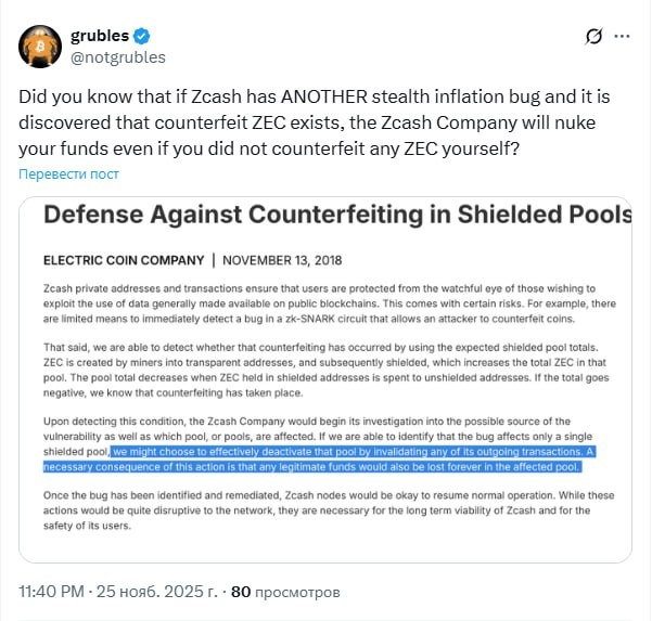 А вы знали, что если в Zcash обнаружится ЕЩЁ ОДНА ошибка со скрытой инфляцией, и выяснится, что существуют поддельные ZEC, то компания Zcash