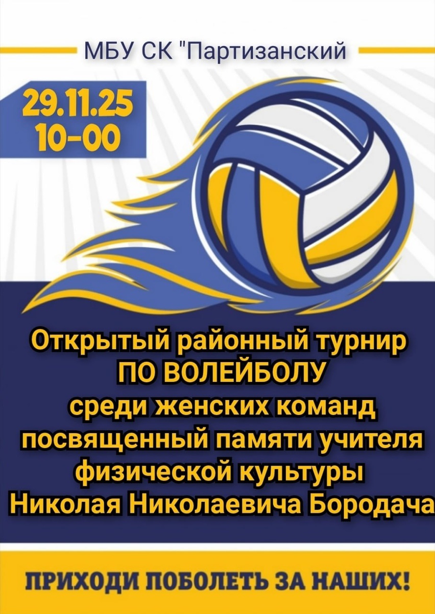 В Партизанском районе пройдет волейбольный турнир памяти Николая Бородача В субботу, 29 ноября 2025 года, в 10:00 в СК «Партизанский» состоится Открытый районный турнир по волейболу среди женских команд. Соревнования посвящены памяти учителя физкультуры Николая Бородача. Вход для зрителей свободный. 🌐 Сайт | 📱 Telegram | 📱 ВК | 📱 ОК | 📱 Дзен