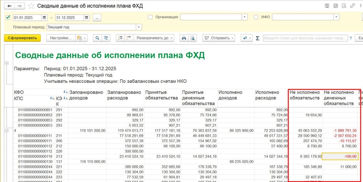 8#. 📉 С помощью отчета «Сводные данные об исполнении плана ФХД» проанализируйте графы: - не исполнено обязательств; - не исполнено денежных обязательств. ❗️При наличии отрицательных сумм в графе «Не исполнено обязательств» проверить все ли обязательства внесены с помощью документа «Регистрация обязательств». ℹ️ Суммы граф: "Не исполнено обязательств" и "Не исполнено денежных обязательств" в дальнейшем отражается в регламентированных формах 0503737, 0305738. А у вас есть проблемы с заполнением данных форм? Автоматически их заполняете или корректируете вручную? - Поделитесь в комментариях #проверкаБГУ