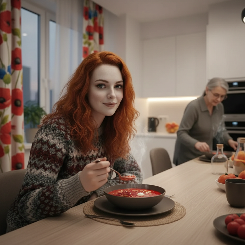 Я посмотрела на тарелку. Красное, густое, с плавающими кусочками мяса, свеклы и капусты. Запах был… ну, очень. Для меня это было как для вегетарианца, которому предложили стейк с кровью.