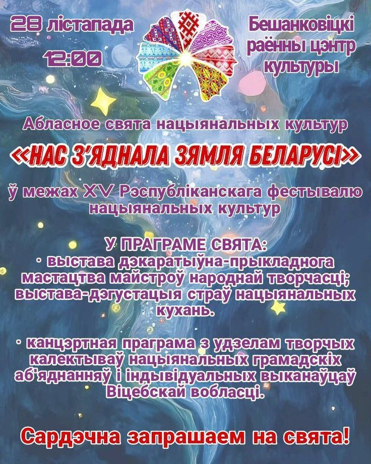 ⚡️У гэту пятніцу, 28 лістапада, у Бешанковічах плануецца вялікае свята творчасці! 💥У РЦК адбудзецца абласное свята нацыянальных культур "Нас з'яднала зямля Беларусі" ў межах XV Рэспубліканскага фестывалю нацыянальных культур. 📌Запрашаюцца ўсе жадаючыя. Уваход — свабодны!