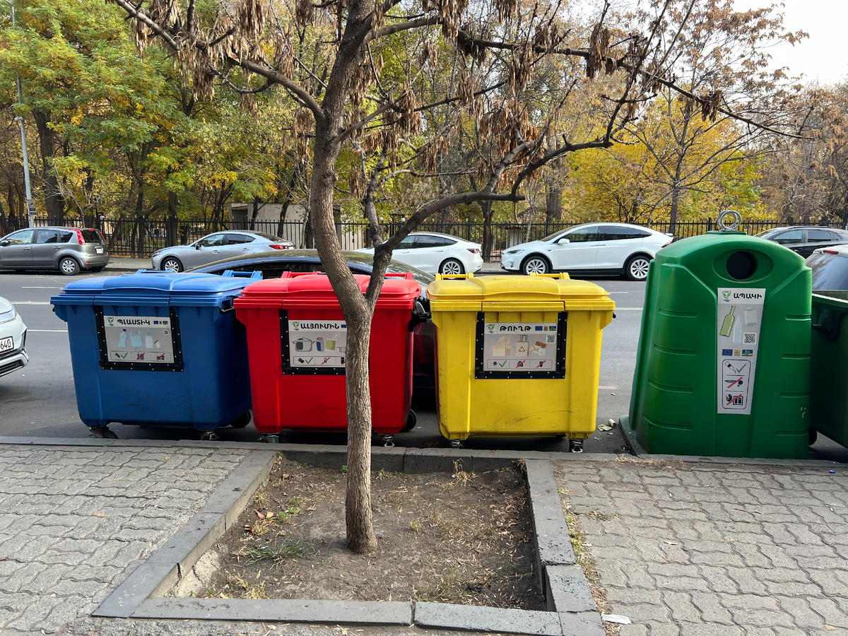 Наглядное отличие настоящего раздельного сбора отходов на улицах Еревана от двухпоточного "нечто" во дворах Москвы: - наличие разных фракций, что делает слово "раздельный сбор отходов" понятным людям и агитирует само за себя; - площадка чистая и к ней удобно и не страшно подойти; - КРЫШКИ! Все контейнеры для вторсырья имеют специальные отверстия, а сам контейнер закрыт крышкой :) Таким образом кастрюлю борща в макулатуру не вылить и пакет с мусором в пластик не засунуть. Для таких случаев рядом стоит бак для остального мусора с открытой крышкой; - Понятные картинки на баках, которые объясняют, что и куда класть. И тогда вторичное сырье будет выглядеть как на фото. А если к площадке страшно подойти, крышки на распашку и непонятно, что, зачем и почему, то раздельного сбора нет, не было и не будет, как бы вы не рекламировали мегасортировки с роботами и оптическими помощниками :( Но в раздельном сборе отходов в Ереване катастрофически не хватает контейнера для раздельного сбора пище