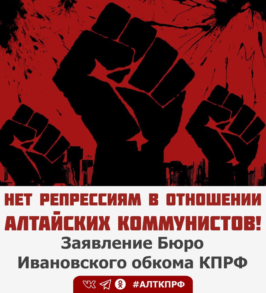 Нет репрессиям в отношении алтайских коммунистов! Заявление Бюро Ивановского обкома КПРФ В последнее время в нашей стране, на фоне экономического и политического кризиса, нарастают также признаки «кризиса верхов», когда правящему классу становятся тесными рамки даже буржуазного законодательства, и у него возникает необходимость в тотальном контроле над населением и подавлении оппозиции любыми, в том числе самыми жёсткими и грубыми методами. Яркой иллюстрацией этого являются события, происходящие в Алтайском крае. Октябрьский районный суд г. Барнаул на два месяца отправил под арест депутата фракции КПРФ в Законодательном Собрании Алтайского края Людмилу Клюшникову и её помощника Светлану Кербер. Им предъявлено обвинение в мошенничестве по ч.4 ст.159 УК РФ, якобы «совершенном организованной группой» и «в особо крупном размере». Насколько известно, поводом для этого правоохранители считают «фиктивное трудоустройство» Кербер помощником депутата при фактическом невыполнении соответству