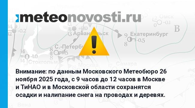 Внимание: по данным Московского Метеобюро 26 ноября 2025 года, с 9 часов до 12 часов в Москве и ТиНАО и в Московской области сохранятся