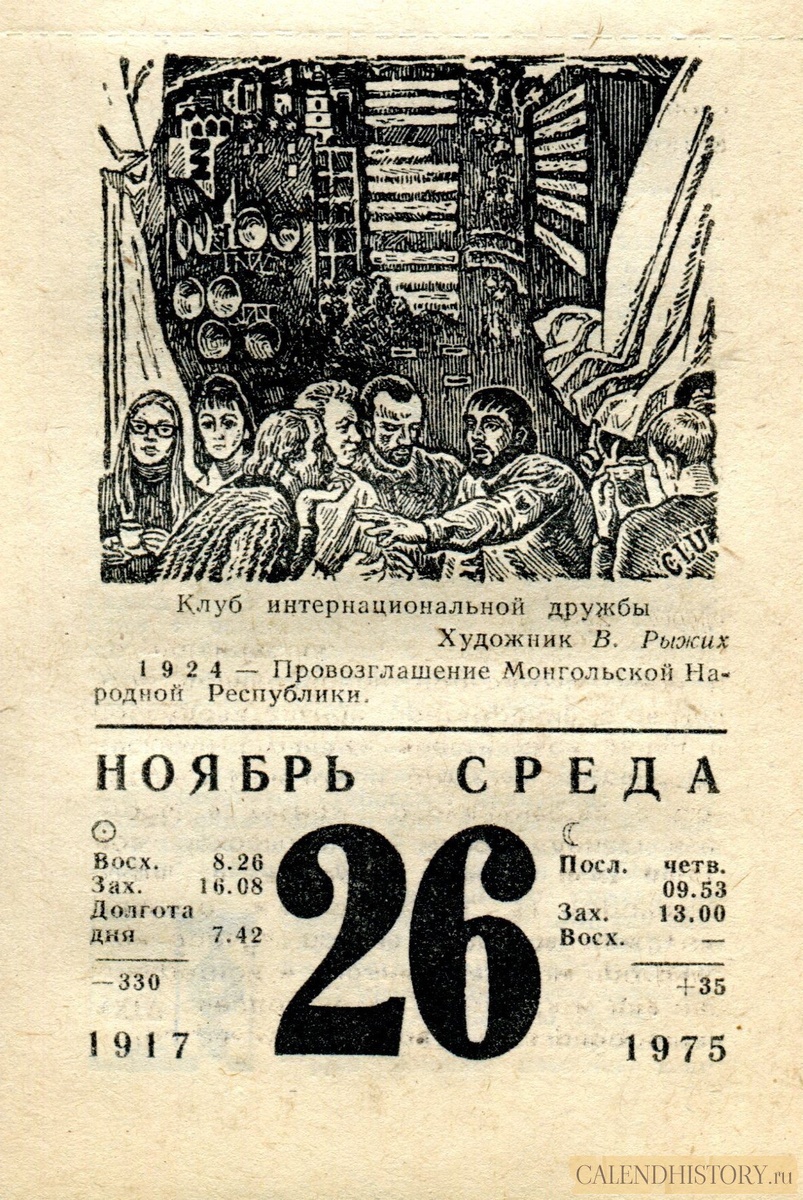 Листок советского отрывного календаря 50-летней давности 26 ноября 1975-го года — Календарь для женщин Клуб интернациональной дружбы. Художник В. Рыжих 1924 — Провозглашение Монгольской Народной Республики. Больше старых советских отрывных календарей смотрите у нас на сайте - calendhistory.ru https://calendhistory.ru/26-nojabrja-1975-go-goda-kalendar-dlja-zhenshhin/