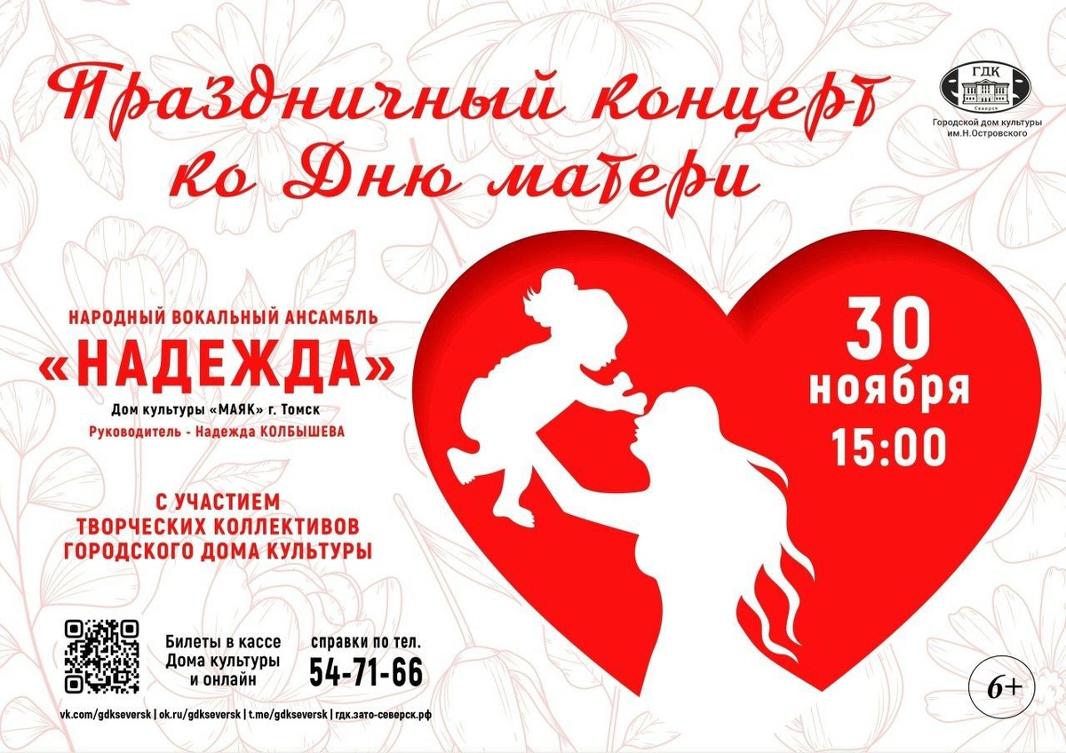 ГДК им.Н.Островского приглашает 30 ноября на праздничный концерт, посвящённый Дню матери В программе вас ждут яркие выступления любимых творческих коллективов нашего Дома культуры, а также особенный гость — Народный вокальный ансамбль «Надежда» из ДК «Маяк» (г. Томск). Начало в 15:00. #СеверскАфиша