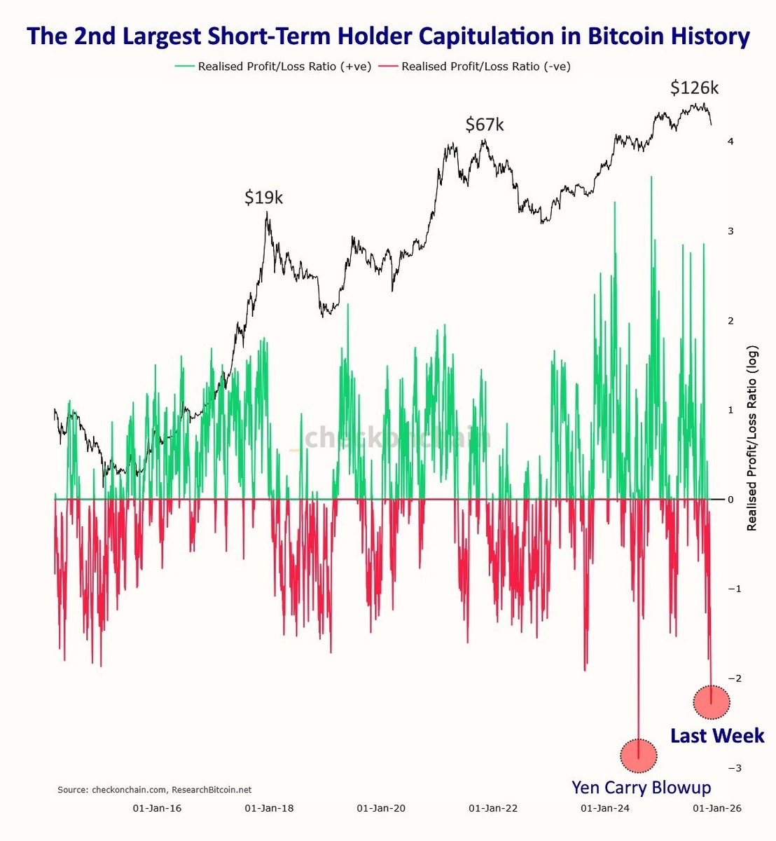На прошлой неделе случилось второе по масштабу событие капитуляции краткосрочных держателей за всю историю биткоина #BTC 👀 Дальше можно не читать. Больше было только во время обвала иены, когда #BTC срывался к $49 000. Если коротко: краткосрок снова вылетел в панику, нажал фиксировать убытки, и рынок показал очередной учебник по тому, как толпа действует в стрессе 🐹 Почему это важно? Такие точки всегда происходят на перегибе эмоций - когда большинство отказывается выдерживать давление и выходит в минус, либо принудительно их ликвидируют. И именно в эти моменты рынок чаще всего разворачивается в пользу тех, кто сохраняет голову холодной и имеет свободный капитал. Я сейчас в позициях. И именно поэтому говорю спокойно: в моей практике чем сильнее толпа дергается, тем больше смысла в простой, но крайне неприятной стратегии - действовать наоборот. Не угадывать, не геройствовать - а смотреть на то, что реально происходит под поверхностью всего шума и балагана, это будет точно с нами вс