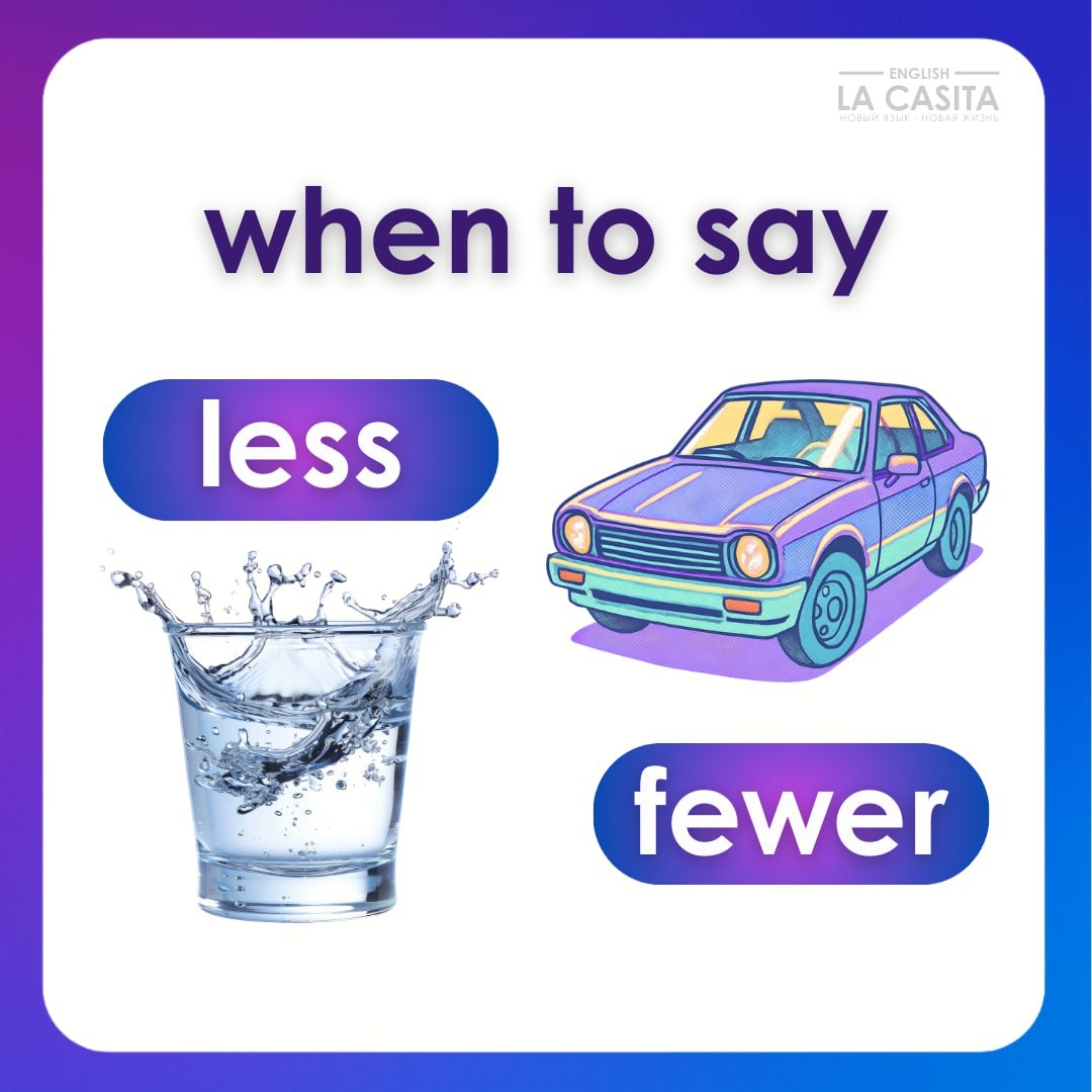 Когда говорить less, а когда — fewer. Русскоязычным это вообще ад: в русском всё «меньше». А в английском — нет. Английский такой: «держи два варианта и не перепутай». 🎯 Главное правило (которое спасёт вашу жизнь) FEWER — с исчисляемыми существительными. (тем, что можно посчитать поштучно) LESS — с неисчисляемыми. (тем, что не считают поштучно — масса, вещество, абстракции) 🔢 FEWER — когда можно «раз-два-три» fewer people — меньше людей fewer mistakes — меньше ошибок fewer lessons — меньше уроков fewer cars — меньше машин fewer opportunities — меньше возможностей (да, opportunities — тоже штуки, их можно посчитать) 🥛 LESS — когда не поштучно less water — меньше воды less sugar — меньше сахара less time — меньше времени less money — меньше денег (деньги у носителей — масса, а не монетки) less stress — меньше стресса less information — меньше информации 🤯 Но английский не был бы английским без исключений ✔️ Less можно использовать с distance, time, money Даже если по логике о