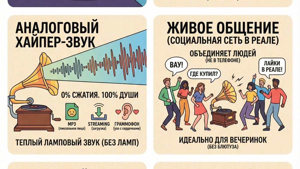 ⚡️Тут всё придумала нейросеть! Всё!!! Вот сижу теперь и размышляю: радоваться или бомбить? ИИ-креатив смешной и логичный, картинки красивые и аккуратные, инфографика современная и сложная. Русский текст написан ИДЕАЛЬНО! И зачем тогда мы?!.. ⚡️Сделано в Nano Banana PRO, генеративной модели от Google. Вышла 20 ноября 2025 года и, как обычно, взорвала сообщество ИИ-креаторов (потому что каждый раз кажется: куда уж дальше-то? и каждый раз создатели нейронок идут дальше и удивляют). Промт: Продай граммофон на Авито как будто это супер современная техника. Это должны быть карточки-приколы. Придумай дизайн карточек, инфографику, все преимущества граммофона, весь текст и юмор. Сделай так, чтобы граммофон захотелось купить. Стиль - плоская иллюстрация, шрифт гротеск НЕЙРОШТУКИ • Дизайн • Искусство • Нейросети