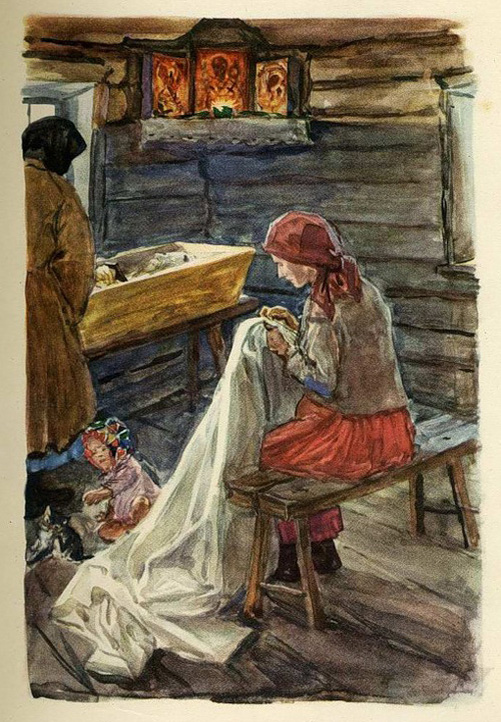 Николай Алексеевич так ярко описывает происходящее, что оно мгновенно визуализируется перед глазами читающего: старушка - мать, везущая на дровнях гроб для сына, старик - отец, ковыряюший ломом мëрзлую землю для могилы, жена, обильно поливающая слезами сшитый ею саван, сам мертвец, лежащий на столе в новых липовых лаптях, стенания над ним родных, на которые стекаются все соседи, нехитрый крестьянский ужин из капусты и кваса, дьячок, всю ночь читающий над усопшим молитвы и вторящий ему из - за печи сверчок, похороны (у меня навсегда отпечаталась в мозгу картина Перова "Проводы покойника", репродукцию которой наша учительница литературы показывала нам при изучении поэмы) ... Тяжёлое, гнетущее впечатление вызывает часть "Смерть крестьянина".