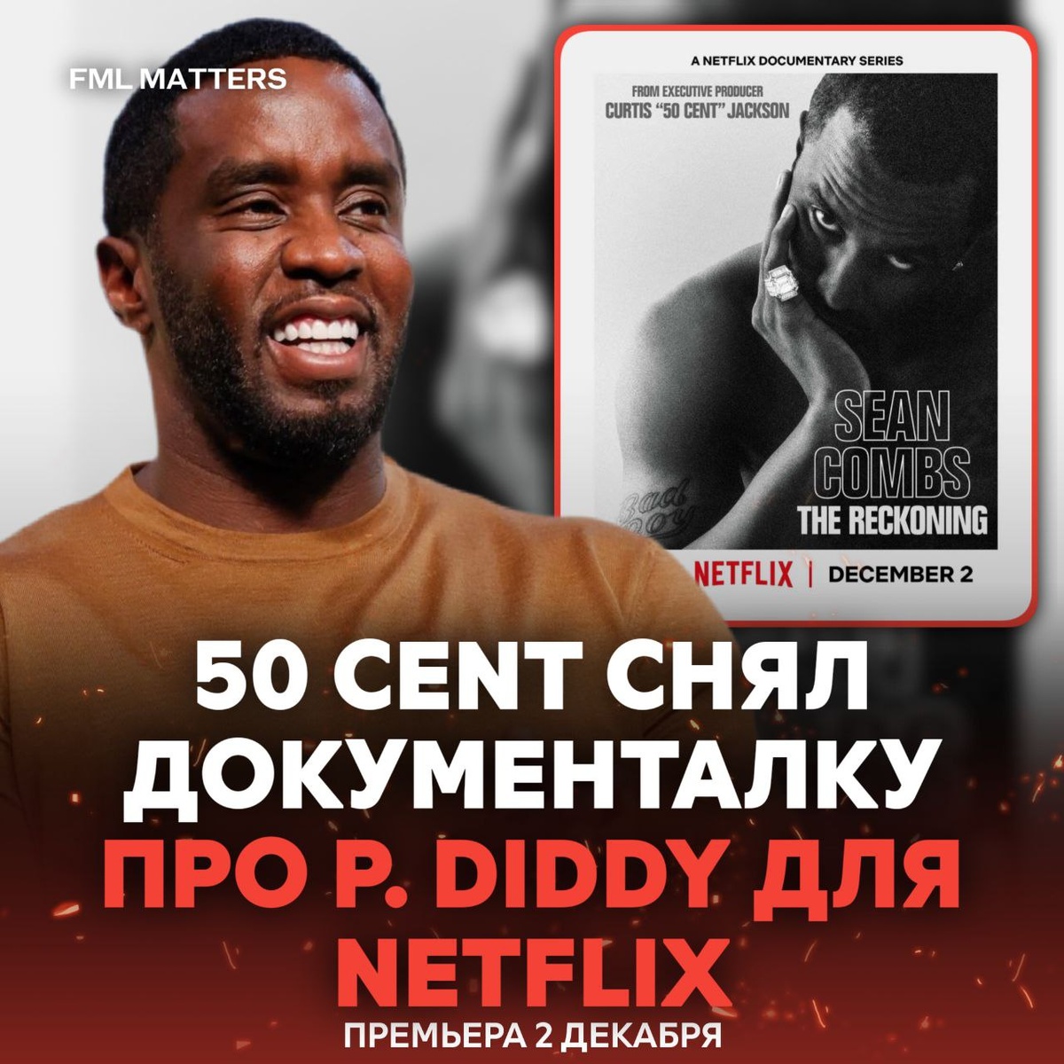 🚨 50 CENT СНЯЛ ДОКУМЕНТАЛКУ ПРО P. DIDDY ДЛЯ NETFLIX! Рэпер представил первый постер документального сериала о жизни Паффа «Sean Combs: The Reckoning», который выйдет 2 декабря 2025 года на Netflix. Смотрим? ❤️🔥 / 👎 💀 FML MATTERS