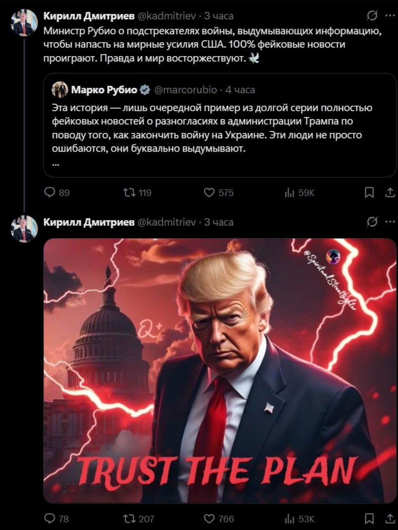 МОСКВА, 26 ноября. /ТАСС/. Спецпредставитель президента России по инвестиционно-экономическому сотрудничеству с зарубежными странами, глава РФПИ Кирилл Дмитриев назвал фейком опубликованную агентством Bloomberg информацию о его телефонном разговоре с помощником президента России Юрием Ушаковым. "Фейк", - прокомментировал Дмитриев в X публикацию агентства. Всё перерыл в твиттере Дмитриева, но там такой публикации нет (скрины последних постов приложил) Помощник Путина Ушаков не стал отрицать разговора с Уиткоффом. Он считает, что задача "слива" разговора - помешать налаживанию контактов РФ и США. Я с Уиткоффом часто разговариваю, но содержание не комментирую. Я с любым человеком могу по телефону поговорить, как и с Дмитриевым. Почему интересует мой разговор с Дмитриевым? ... Кто-то прослушивает, кто-то сливает, но не мы. Понятно, что цель слива – это представить позицию «Уиткоффа-Венса», как пророссийскую. Однако сам факт, что помощника российского президента прослушивают и публику