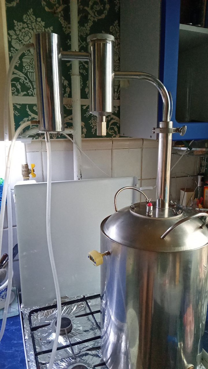 Сегодня мы поговорим о том, как можно модернизировать самогонный аппарат. Самая важная часть самогонного аппарата — это холодильник. Именно в нем конденсируются спиртовые пары. Со спиральной противоточной системой без застоя воды. Полуторадюймовый холодильник полметра длиной с трубками из меди или нержавейки утилизирует до 7 киловатт, а двухдюймовый — до 11. С мощной индукционной он выдаст 6-8 литров в час на дробной перегонке, и это если работать без дефлегматора. О дефлегматоре. Перегонять без него, конечно, быстрее, но с ним самогон крепче и чище. Дефлегматор устанавливается над царгой, его еще называют обратный холодильник. Пары дистиллята внутри охлаждаются и разделяются на фракции. Флегма стекает обратно в перегонный куб, а спирт улетает вверх по колонии. В результате растет крепость и чистота продукта. Дефлегматор кожухотрубного типа. Внутри располагается несколько каналов трубок, в которых охлаждаются пары. В полуторадюймовом их 5, а в двухдюймовом 9. Ну а теперь поговорим о ц