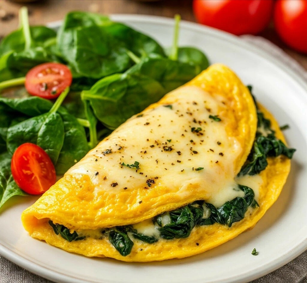 СЫРНЫЙ КЕТО-ОМЛЕТ С ШПИНАТОМ И ТРЕМЯ ВИДАМИ СЫРА ИНГРЕДИЕНТЫ (на 1 порцию): 🧾 · Яйца куриные: 2 шт. (около 100 г) · Шпинат свежий: 50 г · Сыр моцарелла (тертый): 30 г · Сыр чеддер (тертый): 20 г · Сыр пармезан (тертый): 15 г · Сливки 33%: 2 ст. л. (30 мл) · Масло сливочное: 20 г · Соль, перец черный молотый: по вкусу ВРЕМЯ ПРИГОТОВЛЕНИЯ: ⏰ 15 минут КБЖУ на порцию:📊 Калории: 490 ккал, Белки: 32 г, Жиры: 39 г, Углеводы: 4 г (из них клетчатка: 2 г) СЛОЖНОСТЬ:🐾 Проще некуда ПОШАГОВЫЙ РЕЦЕПТ: 👩🍳 1. Яйца взбейте венчиком в миске со сливками, солью и перцем. 🥚 2. Шпинат хорошо промойте и обсушите. 🌿 3. Смешайте все три вида тертого сыра в отдельной мисочке. 🧀 4. На сковороде растопите сливочное масло на среднем огне. Добавьте шпинат и обжаривайте 1-2 минуты, пока он не увянет. 🍳 5. Влейте яичную смесь. Убавьте огонь до среднего-малого. 🔥 6. Когда края омлета начнут "схватываться", лопаткой поддвиньте их к центру. 7. Когда середина омлета почти схватится, но еще будет слегка вла