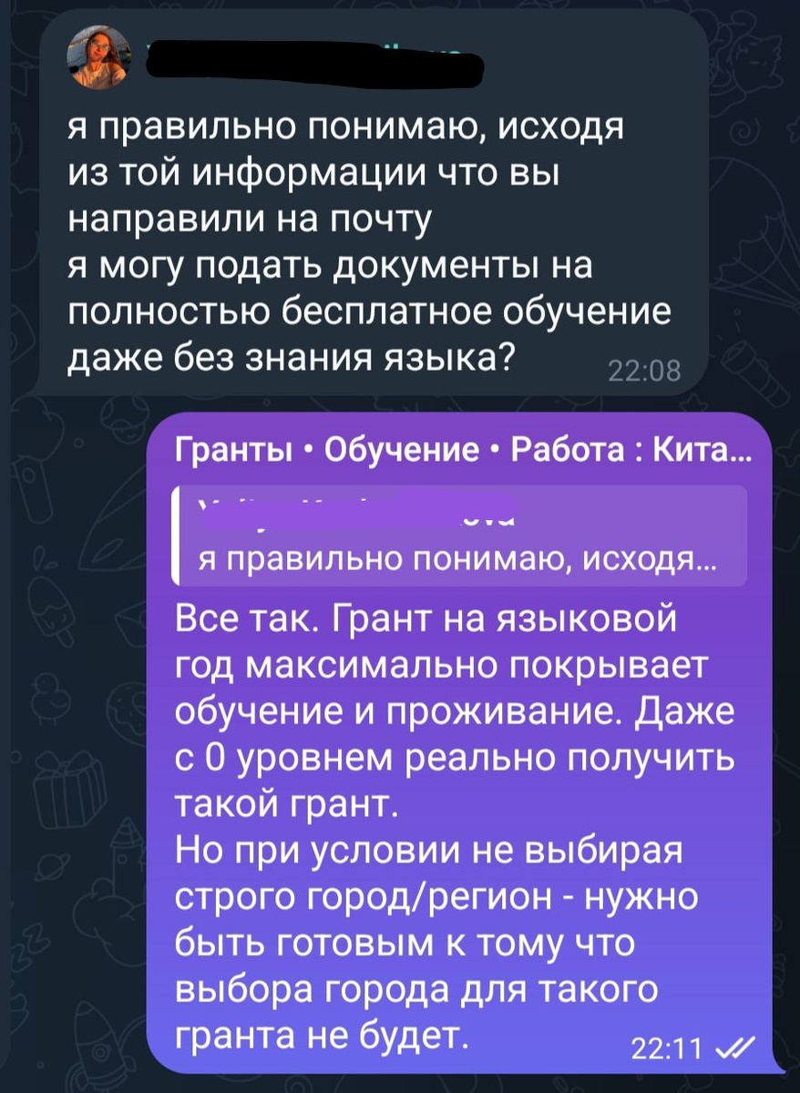 📍 После заполнения нашей анкеты вы получаете письмо на имейл с темой "Разбор анкеты" И не верите🧐🤨 нам/глазам своим, что с начальным и даже совсем нулевым знанием китайского вам доступны гранты на курсы китайского в университетах Китая Ниже подборка постов с подтверждениями нашим клиентам, у которых был 0 или начальный уровень языка на момент подачи заявок : для Екатерины и Полины для Анастасии, Марии и Валерии для Ирины для Гульназ подтверждения в 2024 И это только те что опубликованы здесь постами, тк: и не хватает времени выкладывать каждое подтверждение, и большинство подтверждений однотипные, а иногда клиенты просят никак не упоминать о них в соц.сетях🙈 - 🆗 🏆Они получили и вы сможете, а мы поможем вам все сделать грамотно и вовремя, что гарантирует вам➕результат 📍БЕСПЛАТНО выучить китайский в Китае — реально, проверено ✍🏻 Заполняй АНКЕТУ / ССЫЛКА / — и мы поможем получить грант на языковой год 2026-27🍀 🔗 САЙТ