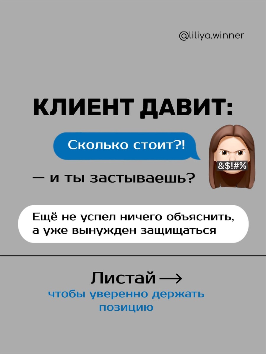 В ответ на пост Клиент давит: "Сколько стоит?" и ты застываешь 😱 ✅ Забирай эту инструкцию как ответить так, чтобы не потерять клиента. Продажи с инструкцией