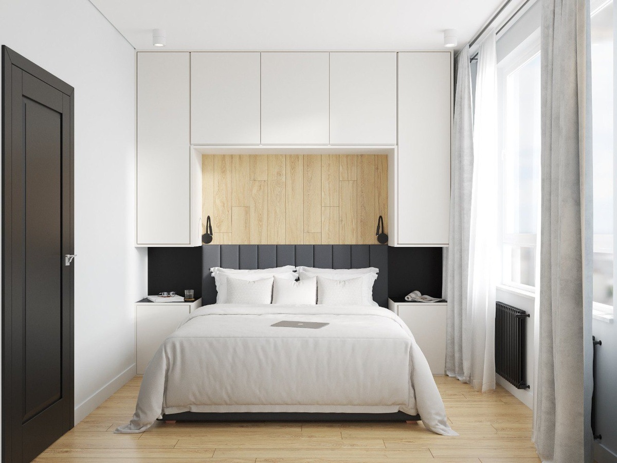 🩷В этой спальне я использовала светлые тона, чтобы создать атмосферу уюта и спокойствия. 💫Деревянный пол не только добавляет теплоты, но и создаёт приятный тактильный контраст с белой мебелью. 💫Центральную часть комнаты занимает большая кровать с белым постельным бельём. Серое изголовье придаёт дизайну изюминку. Прикроватные тумбочки с чёрными нишами по обе стороны от кровати идеально дополняют общий вид. 💫Два белых шкафа с центральной нишей, отделанной тёмным деревом, обеспечивают удобное хранение вещей. Чёрные светильники по бокам ниши создают мягкий, рассеянный свет, который не утомляет глаза. 💫Окно справа от кровати я украсила белыми полупрозрачными шторами и серыми плотными портьерами. Это позволяет регулировать уровень освещения, что особенно важно для создания комфортной атмосферы в спальне. 💫В целом, я считаю, что в этом интерьере удалось удачно сочетать светлые тона, дерево и современные элементы, создавая гармоничное и уютное пространство для отдыха. #project_gd #s